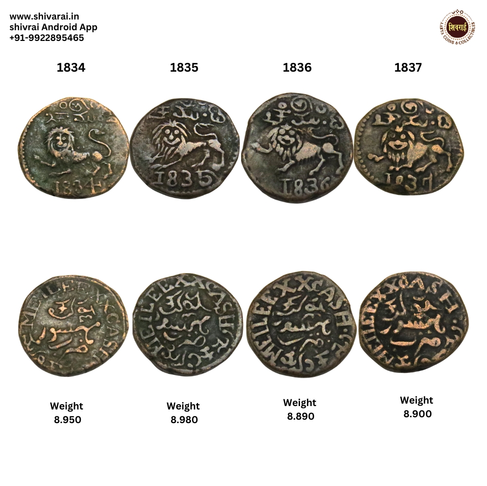Krishnadev Raya Wodiyar, Mysore Set of Eight 20 Cash 1834, 1835, 1836, 1837, 1838, 1839, 1840, 1841 Lion facing left Weight : Grams : 8.950, 8.980, 8.890, 8.900, 8.790, 8.920, 9.040, 8.570